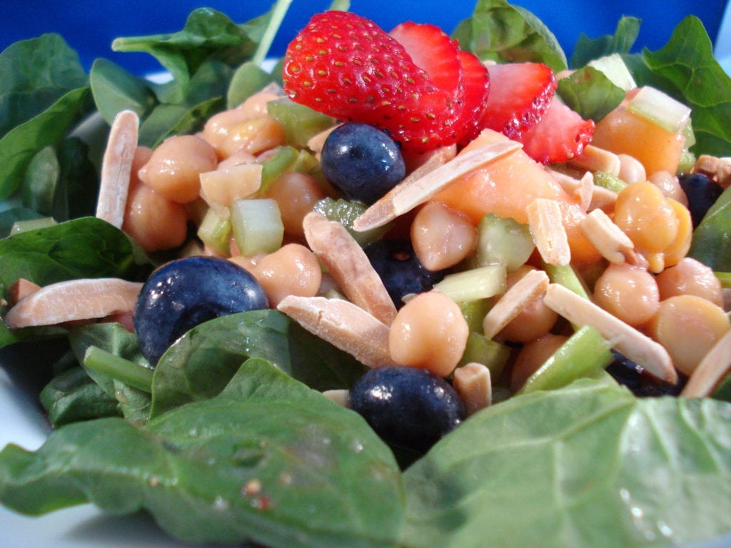 No-Meat Athlete posted a great salad recipe that, while it had chickpeas, celery, slivered almonds and baby spinach, also had melon. blueberries, and a strawberry-agave dressing. I made a big batch of the salad on Monday and have been eating it for breakfast all week and loving it. I'm stuffed and stay full full until lunch.